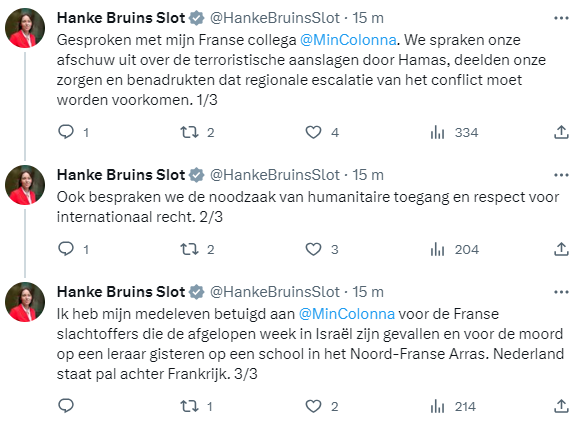 Minister Bruins Slot has contacted her Israeli counterpart, Eli Cohen, to express solidarity with the people Israel. Cohen informed her of the current situation in his country.