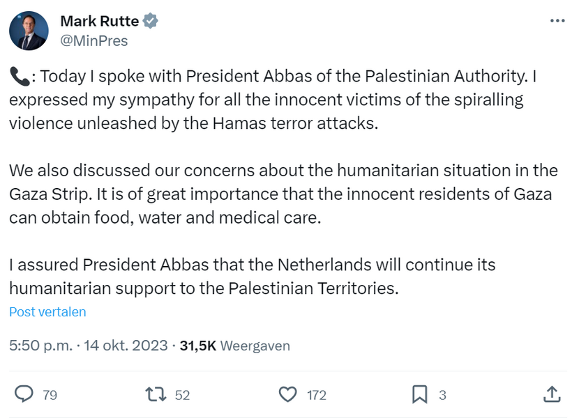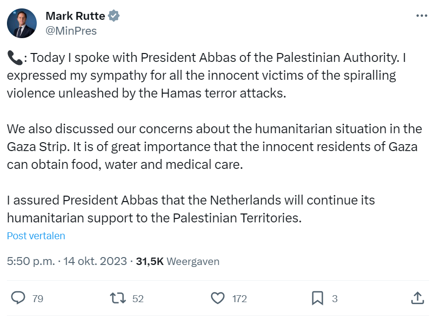 In a post on X, the Dutch prime minister stated that regional escalation must be prevented at all costs, adding, ‘A two-state solution is needed now more than ever.’ He spoke later in the evening with French President Emmanuel Macron and Egyptian President Abdel Fattah El-Sisi. In both these conversations the Dutch prime minister expressed his concern about the conflict and underlined the need to provide humanitarian aid to Gaza.