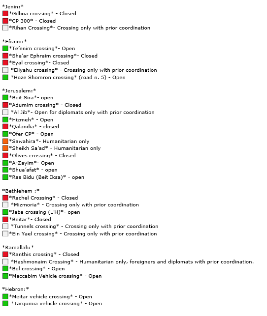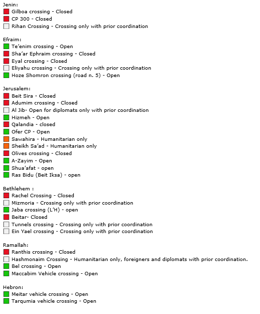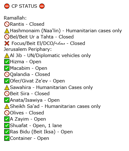 We received the following information about checkpoints on the West Bank for today (Monday 23 October):