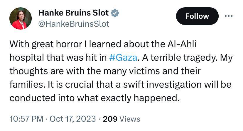 Minister of Foreign Affairs Hanke Bruins Slot spoke with her colleagues in Egypt and the United Arab Emirates on Sunday evening. The minister wrote this on X. Bruins Slot spoke, among other things, about establishing a so-called 'corridor' through which aid to Gaza, such as food and water, can be delivered from Egypt.