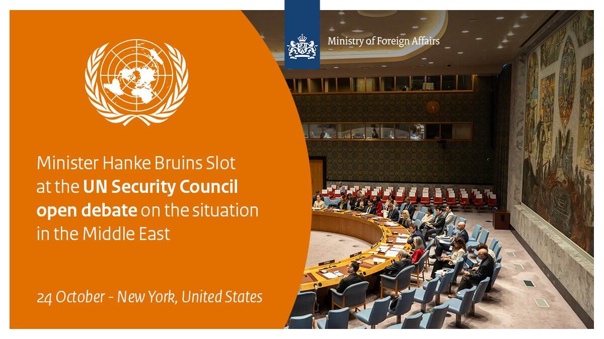 Tomorrow (24 October), Minister of Foreign Affairs Hanke Bruins Slot will attend the UN Security Council in New York for a debate on the Middle East. In a post on X the minister wrote: ‘Colleagues from all across the world will gather to discuss the situation in Israel and the Palestinian Territories. The international community must do all it can to prevent regional escalation.