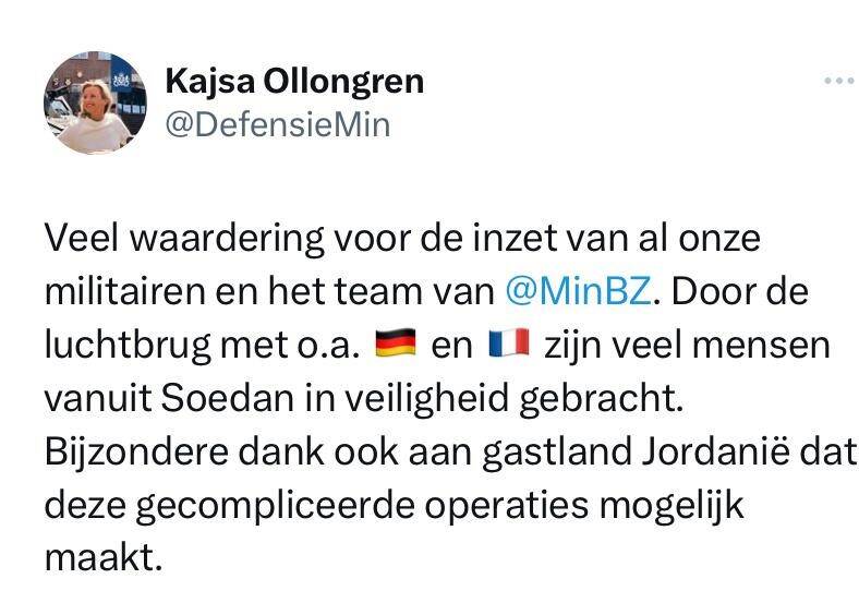 Dutch Minister of Defense Kajsa Ollongren is very happy with the good collaboration with other countries during the evacuations from Sudan. 'Much appreciation for the efforts of all our soldiers and the team of @MinBZ. Due to the airlift with Germany and France, among others, many people from Sudan have been brought to safety. Special thanks also to host country Jordan for making these complicated operations possible.'