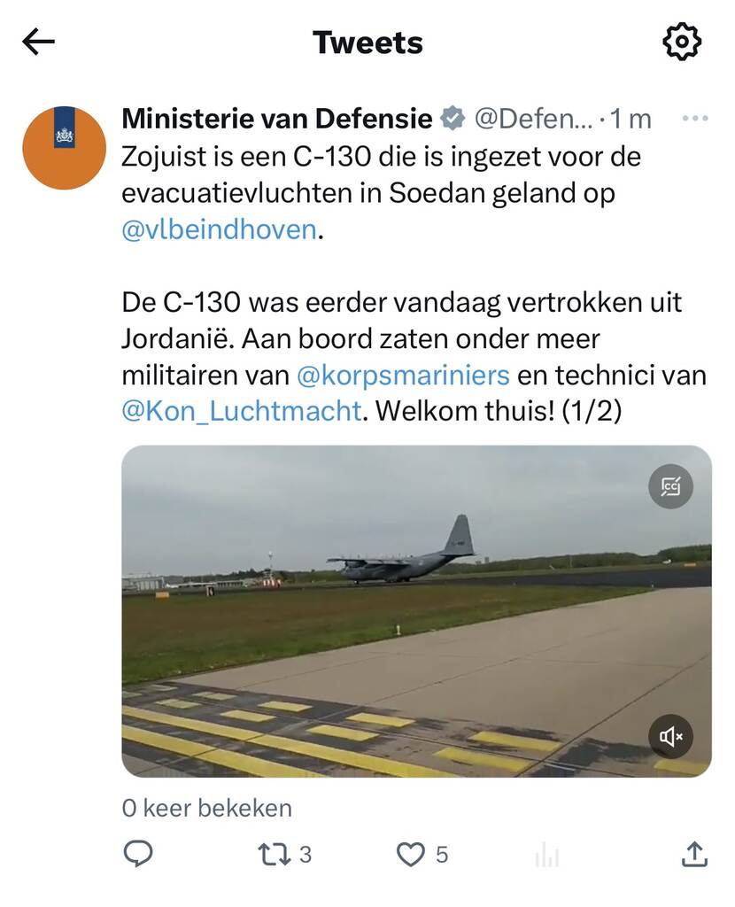 The Netherlands has completed seven evacuation flights from Sudan. At least 160 Dutch citizens have now safely been evacuated, over 85 by the Royal Netherlands Air Force. Around 130 people from 18 other nationalities were also evacuated on Dutch flights. Various international partners are still carrying out evacuation flights. We greatly sympathize with anyone currently in Sudan. Read the update by the Ministry of Foreign Affairs on Twitter.
