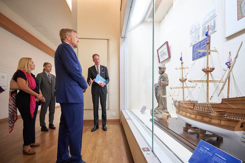 Throughout May, Osaka Castle is spotlighting the long-standing relationship between Japan and the Netherlands. The exhibition A New Dawn on Common Ground: 425 Years of Exchange between Japan and the Netherlands features objects dating back to the year 1600. That year, the Dutch ship De Liefde arrived in Japan, carrying the first Dutchmen to make contact with the country. This meeting eventually led to an exclusive trading relationship that lasted more than 200 years. On the second day of his visit, the King visited this exhibition, which was organized by the Dutch Consulate in Osaka and features items from both Dutch and Japanese collections.