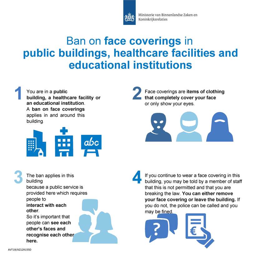 The ban on wearing face coverings applies in and around the buildings of healthcare institutions, educational institutions and government organisations and on public transport. In these places you may not wear clothing that makes your face unidentifiable.