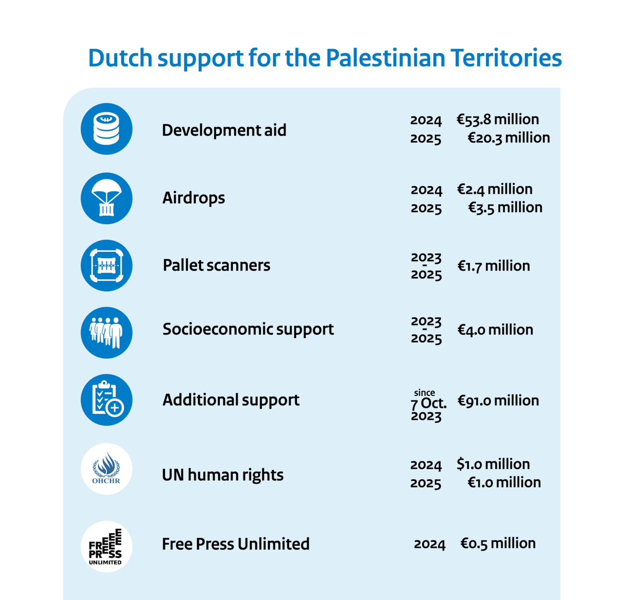 The Netherlands continues to support the Palestinian Territories with humanitarian and development aid. This aid contributes to stability in the West Bank and in the Gaza Strip and, by extension, to the security of Israel and the wider region. Since 7 October 2023, the Netherlands has made over €91 million available for additional humanitarian aid, especially for the Gaza Strip. The Netherlands has also set aside €20 million for the reconstruction of the Gaza Strip, including €10 million to repair the water facilities. Together with an international coalition, the Netherlands is also delivering aid goods to Gaza by air.